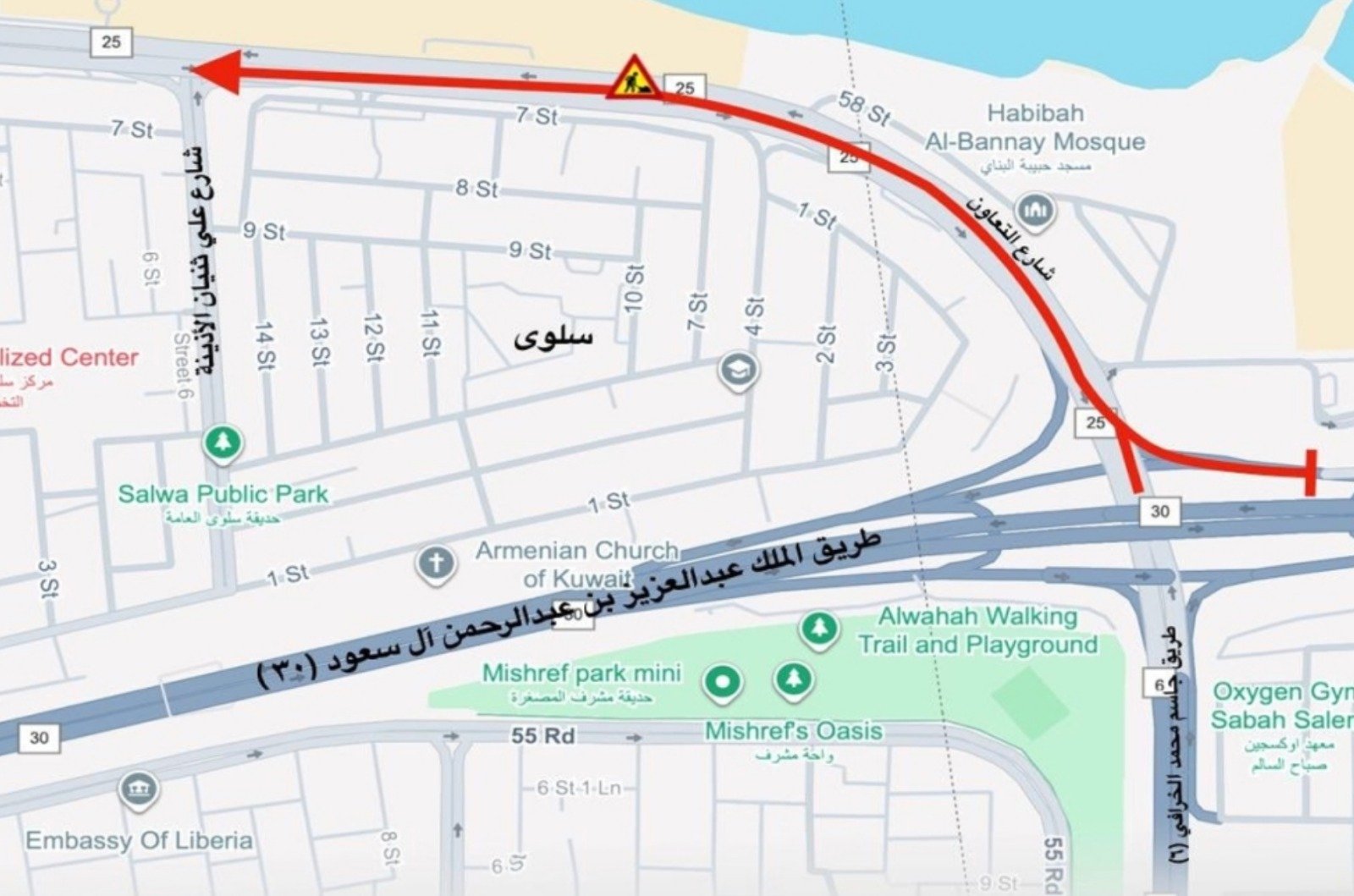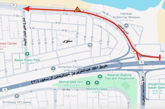 കുവൈറ്റ് സിറ്റി : ജാസിം അൽ-ഖറാഫി റോഡ് (ആറാം റിങ് റോഡ്), കിംഗ് അബ്ദുൽ അസീസ് ബിൻ അബ്ദുൾറഹ്മാൻ അൽ സൗദ് റോഡ് (ഫഹാഹീൽ) എന്നിവിടങ്ങളിൽ നിന്ന് അലി തുനയ്യാൻ അൽ-ഉതൈന സ്ട്രീറ്റിന്റെ ഇന്റർസെക്ഷൻ വരെ അൽ-ബിദ റൗണ്ട്എബൗട്ടിലേക്ക് വരുന്നവർക്കായി അൽ-താവൂൺ സ്ട്രീറ്റിൽ ഒന്നര വരി പാത അടച്ചിടുമെന്ന് ജനറൽ ട്രാഫിക് വകുപ്പ് പ്രഖ്യാപിച്ചു. 2025 ഡിസംബർ 27 ശനിയാഴ്ച മുതൽ 2025 ഡിസംബർ 31 ബുധനാഴ്ച വരെ വൈകുന്നേരം 5:00 മുതൽ പുലർച്ചെ 5:00 വരെ ആവശ്യമായ റോഡ് അറ്റകുറ്റപ്പണികൾ നടത്തുന്നതിന് ഇത് ബാധകമാണ്.
