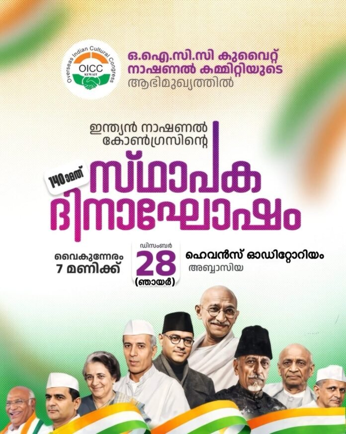 ഇന്ത്യൻ നാഷണൽ കോൺഗ്രസിന്റെ 140-ാം സ്ഥാപകദിനം:ഡിസംബർ 28ന് ഒഐസിസി കുവൈറ്റ് വിപുലമായ ആഘോഷപരിപാടികൾ സംഘടിപ്പിക്കും