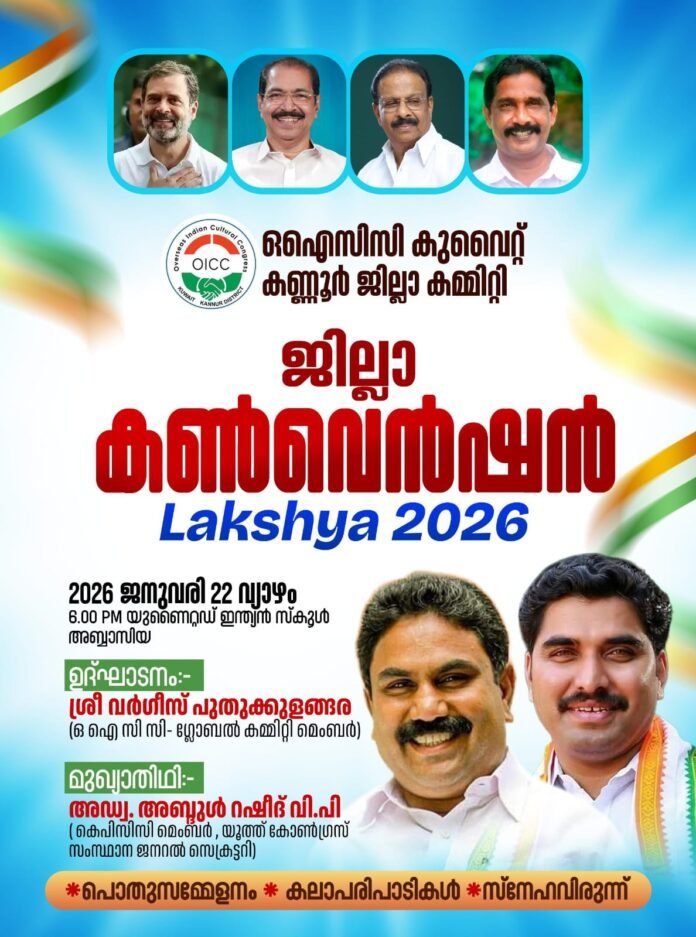 ഒ ഐ സി സി കുവൈറ്റ് കണ്ണൂർ ജില്ലാ കമ്മിറ്റിയുടെ ജില്ലാ കൺവെൻഷൻ ( ലക്ഷ്യ-2026) 22-1-2026 വ്യാഴാഴ്ച വൈകിട്ട് 6 മണി മുതൽ അബ്ബാസിയ യുണൈറ്റഡ് ഇന്ത്യൻ സ്കൂളിൽ വെച്ച് നടക്കും.കെ പി സി സി മെമ്പറും, യൂത്ത് കോൺഗ്രസ് സംസ്ഥാന ജനറൽ സെക്രട്ടറിയുമായ അഡ്വ അബ്ദുൽ റഷീദ് വി പി പരിപാടിയിൽ മുഖ്യാതിഥിയായി പങ്കെടുക്കും.ഒ ഐ സി സി ഗ്ലോബൽ കമ്മിറ്റി മെമ്പർ ശ്രീ വർഗീസ് പുതുക്കുളങ്ങര കൺവെൻഷൻ ഉദ്ഘാടനം ചെയ്യും.കുവൈറ്റിലെ രാഷ്ട്രീയ സാംസ്കാരിക മേഖലകളിലെ നിരവധി പ്രമുഖർ ചടങ്ങിൽ പങ്കെടുക്കുമെന്ന് സംഘാടകർ അറിയിച്ചു.