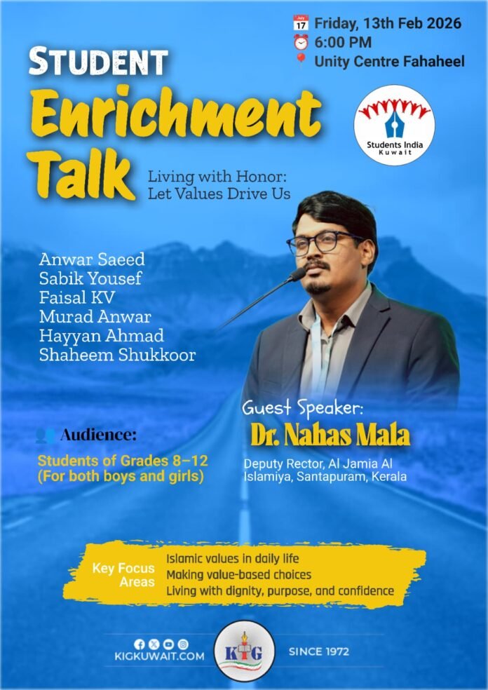 സ്റ്റുഡന്റസ് ഇന്ത്യ കുവൈറ്റ് 8 മുതൽ 12 ക്ലാസ്സ്വരെ ഉള്ള വിദ്യാർത്ഥികൾക്കായി സ്റ്റുഡന്റസ് enrichment പ്രോഗ്രാം സംഘടിപ്പിക്കുന്നു . ഫെബ്രുവരി 13, 2026 വെള്ളിയാഴ്ച വൈകിട്ട് 6:00 മണിക്ക് ഫഹഹീൽ യൂണിറ്റി സെന്റരിൽ പ്രമുഖ വിദ്യാഭ്യാസ വിചക്ഷണനും പ്രഭാഷകനുമായാ ഡോ. നഹാസ് മാള ഡെപ്യൂട്ടി റെക്ടർ, അൽ ജാമിയ അൽ ഇസ്ലാമിയ, ശാന്തപുരം, കേരളം.
