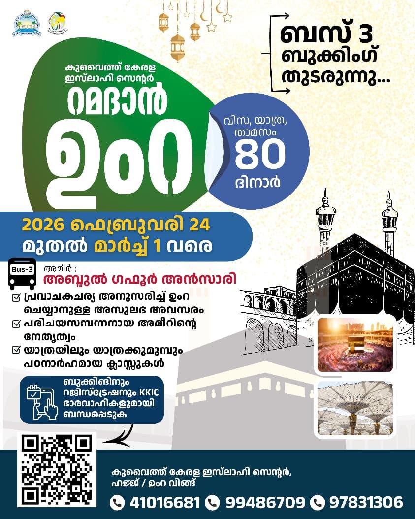 കുവൈത്ത് കേരള ഇസ്ലാഹീ സെൻ്റർ ഹജ്ജ് ഉംറ വകുപ്പിന് കീഴിൽ ഈ വർഷത്തെ റമദാനിലെ ഉംറ കർമ്മത്തിനായി പോകുന്നവർക്കായി ഫെബ്രുവരി 15 ഞായറാഴ്ച രാത്രി 7 മണിക്ക് ഉംറ ക്ലാസ്സ് സംഘടിപ്പിക്കുന്ന. ശർഖിലെ മർക്കസ് അവാധി ഓഡിറ്റോറിയത്തിൽ നടക്കുന്ന ക്ലാസ്സിന് അബദുൽ മജീദ് മദനി നേതൃത്വം നൽകും.ഫെബ്രുവരി 24 ന് പുറപ്പെട്ട് മാർച്ച് 1 ന് തിരിച്ചു വരുന്ന 6 ദിവസത്തെ ഇസ്ലാ ഹീ സെൻ്ററിൻ്റെ ഉംറ സംഘങ്ങൾക്ക് അബ്ദുൽ മജീദ് മദനി, നൗഫൽ സ്വലാഹി, അബ്ദുൾ ഗഫൂർ അൻസാരി എന്നിവർ നേതൃത്വം നൽകുമെന്ന് ഭാരവാഹികൾ അറിയിച്ചു.
