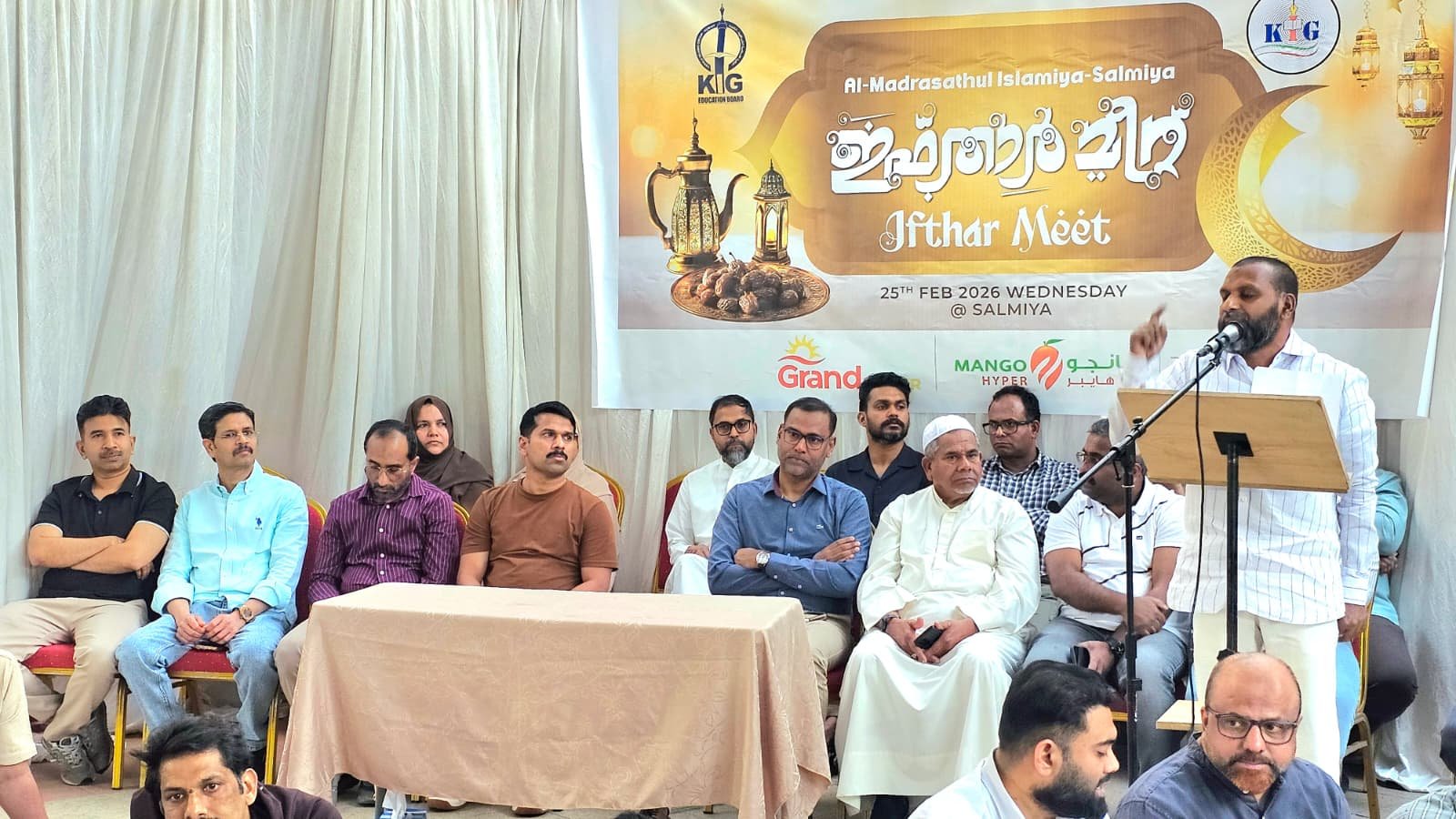 അൽ മദ്രസത്തുൽ ഇസ്ലാമിയ സാൽമിയ ഗ്രാൻഡ് ഇഫ്താർ 2026 സംഘടിപ്പിച്ചു. ഫെബ്രുവരി 25 ബുധനാഴ്ച്ച ഹവല്ലിയിലെ മദ്രസത്തുതൗഹീദ് അങ്കണത്തിൽ വച്ചാണ് ഇഫ്താർ സമ്മേളനം നടന്നത്അബ്ഷർ അനസിൻ്റെ ഖുർആൻ പാരായണത്തോടെ ആരംഭിച്ചു. മദ്രസ്സ പി ടി എ കമ്മിറ്റി ജനറൽ സെക്രട്ടറി അബ്ദുൽ റഷീദ് സ്വാഗതവുംപി ടി എ കമ്മിറ്റി പ്രസിഡണ്ട് ഷംനാദ് ഷാഹുൽ ഹമീദ് അധ്യക്ഷതയും വഹിച്ച ചടങ്ങ് കെ ഐ ജി കേന്ദ്ര ജനറൽ സെക്രട്ടറി സാബിക് യൂസുഫ് ഉദ്ഘാടനം നിർവഹിച്ചു.ചടങ്ങിൽ ഹൃസ്വ സന്ദർശനാർത്ഥം കുവൈത്തിലെത്തിയ ശംസുദ്ധീൻ നദ്വി (ലക്ചറർ ഇസ്ലാമിയ കോളേജ് വാടാനപ്പള്ളി) മുഖ്യ പ്രഭാഷണം നടത്തി. റഫീഖ് അഹ്മദ് (എം ഡി മംഗോ ഹൈപ്പർ) ആശംസകൾ നേർന്നു.മദ്രസ്സ പ്രിൻസിപ്പൽ മുഹമ്മദ് ഷിബിലി സമാപന പ്രാർത്ഥനയും ട്രഷറർ അബ്ദുൽ അസീസ് നന്ദിയും പറഞ്ഞു. വേദിയിൽ ഡോക്ടർ അഷീൽ (പി ടി എ ജനറൽ കൺവീനർ) ആസിഫ് ഖാലിദ് (KIG സാൽമിയ ഏരിയ സെക്രട്ടറി), നിസ്സാർ കെ റഷീദ് (KIG സാൽമിയ ഏരിയ ട്രഷറർ), നൗഫൽ മുഹമ്മദ് (KIG സിറ്റി ഏരിയ പ്രസിഡന്റ്) അറഫാത് (KIG ബോർഡ് സെക്രട്ടറി) സഫ്വാൻ കെ എ (ഏരിയ വിദ്യാഭ്യാസ കൺവീനർ), ജസീറ ആസിഫ് (IWA സാൽമിയ ഏരിയ പ്രസിഡന്റ്) നിഷ ആസിഫ് (IWA സാൽമിയ ഏരിയ സെക്രട്ടറി, നബീൽ (യൂത്ത് ഇന്ത്യ സാൽമിയ ആക്ടിങ് പ്രസിഡന്റ്) എന്നിവരും മറ്റ് സ്പോൺസർമാരായ സുനീർ (ഗ്രാൻഡ് ഹൈപ്പർ) ദിയൂഫ് (സെല്ല ഗോൾഡ്) അബ്ദുൽ ജലീൽ കെ എ (പ്രിൻസിപ്പൽ EMIS സാൽമിയ ) നിയാസ് ഇസ്ലാഹി (പ്രിൻസിപ്പൽ AMI ഫഹാഹീൽ) റസീന മുഹ്യിദ്ധീൻ (പ്രിൻസിപ്പൽ AMI ഫർവാനിയ) ആയിഷ PTP (പ്രിൻസിപ്പൽ AMI അബ്ബാസിയ) എന്നിവരും ചടങ്ങിൽ സന്നിഹിതരായിരുന്നു. ഇഫ്താർ സമ്മേളനത്തിന്റെ കൺവീനർ അബ്ദുൽ റസാഖ് , അധ്യാപകർ, പൂർവ വിദ്യാർഥികൾ സുനീബ അസീസ്, സത്താർ കെ കെ, സുനീർ എം കോയ, അഫ്സൽ സി എം, ആസിഫ് പാലക്കൽ എന്നിവർ നേതൃത്വം നൽകി. അന്താരാഷ്ട്ര അറബി ദിനത്തോടനുബന്ധിച്ച് മദ്രസ്സ വിദ്യാർത്ഥികൾക്കായി സംഘടിപ്പിച്ച കാലിഗ്രഫി മത്സരങ്ങളിലെ വിജയികളായ വിദ്യാർത്ഥികൾക്ക് ചടങ്ങിൽ സമ്മാനങ്ങൾ വിതരണം ചെയ്തു.കാറ്റഗറി ഒന്നിൽ ഒന്നാം സ്ഥാനം നേടിയ ബാസിൽ അബദുൽ റസാഖ്, രണ്ടാം സ്ഥാനം നേടിയ ഒമർ മുഹമ്മദ് ആസിഫ്, മൂന്നാം സ്ഥാനം നേടിയ നസ്നീൻ നിസാർ കാറ്റഗറി രണ്ടിൽ ഒന്നാം സ്ഥാനം നേടിയ ആലിയ നൂർ, രണ്ടാം സ്ഥാനം നേടിയ ഫർഹാൻ ഹമീദ് എന്നീ വിദ്യാർത്ഥികൾക്കുമാണ് വിശിഷ്ടതിഥികൾ സമ്മാനങ്ങൾ കൈമാറിയത്. പങ്കെടുത്ത മുഴുവൻ വിദ്യാർത്ഥികൾക്കും പ്രോത്സാഹന സമ്മാനങ്ങൾ നൽകി.