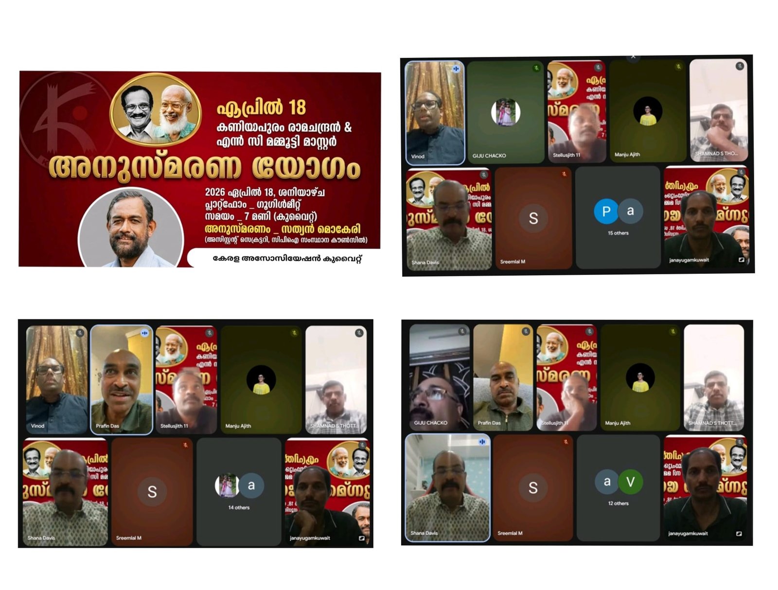 കുവൈറ്റ് സിറ്റി:കേരളത്തിന്റെ സാമൂഹിക-രാഷ്ട്രീയ മണ്ഡലങ്ങളിൽ നിറസാന്നിധ്യമായിരുന്ന സഖാവ് കണിയാപുരം രാമചന്ദ്രനെയും, എൻസി മമ്മൂട്ടി മാസ്റ്ററെയും അനുസ്മരിച്ചുകൊണ്ട് കേരള അസോസിയേഷൻ കുവൈറ്റ് ഓൺലൈനായി അനുസ്മരണ യോഗം സംഘടിപ്പിച്ചു.സിപിഐ സംസ്ഥാന അസിസ്റ്റന്റ് സെക്രട്ടറി സത്യൻ മൊകേരി അനുസ്മരണ യോഗം ഉദ്ഘാടനം ചെയ്തു. അർപ്പണബോധമുള്ള പൊതുപ്രവർത്തകരായിരുന്നു ഇരുവരും എന്ന് അദ്ദേഹം അനുസ്മരിച്ചു.
