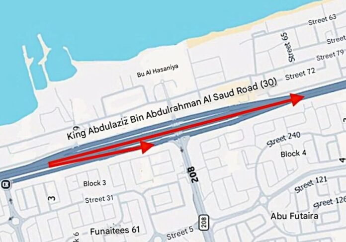 ഏപ്രിൽ 28 ചൊവ്വാഴ്ച പുലർച്ചെ മുതൽ 15 ദിവസത്തേക്കാണ് റോഡ് ഭാഗികമായി അടച്ചിടുന്നത്. ഫുനൈതീസിനും അബു ഫുത്തൈറയ്ക്കും എതിർവശത്തുള്ള പാതയിലാണ് അറ്റകുറ്റപ്പണികൾ നടക്കുന്നത്. ഇതുവഴിയുള്ള എമർജൻസി ലെയ്ൻ, വലതുവശത്തെ ലെയ്ൻ, മിഡിൽ ലെയ്നിന്റെ പകുതി ഭാഗം എന്നിവ ഗതാഗതത്തിനായി ഉപയോഗിക്കാൻ സാധിക്കില്ലെന്ന് അധികൃതർ വ്യക്തമാക്കി.കൂടാതെ നുവൈസീബ് ദിശയിലുള്ള റോഡ് 208-ലേക്കുള്ള ബ്രിഡ്ജ് എൻട്രൻസും ഈ കാലയളവിൽ പൂർണ്ണമായും അടച്ചിടും.