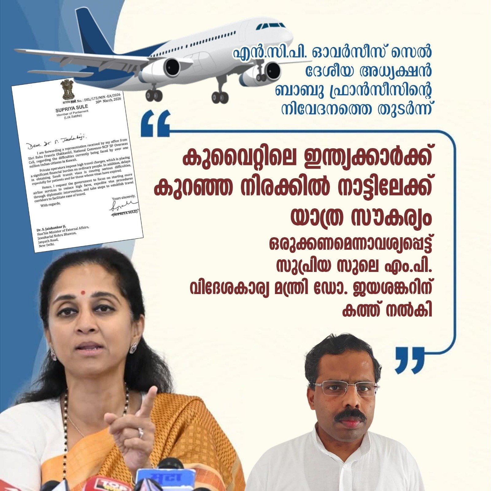 കുവൈറ്റ് സിറ്റി: കുവൈറ്റിൽ നിന്നുള്ള പ്രവാസി ഇന്ത്യക്കാർ വിമാന യാത്രയിൽ നേരിടുന്ന അതിരൂക്ഷമായ യാത്രാ പ്രതിസന്ധി പരിഹരിക്കാൻ കേന്ദ്ര സർക്കാർ അടിയന്തിരമായി ഇടപെടണമെന്ന് എൻ സി പി എസ് പി വർക്കിംഗ് പ്രസിഡണ്ട് സുപ്രിയ സുലെ എം.പി. എൻ സി പി എസ് പി ഓവർസീസ് സെൽ ദേശീയ അധ്യക്ഷനും, ലോക കേരള സഭ പ്രതിനിധിയുമായ ‘ബാബു ഫ്രാൻസീസ് കേന്ദ്ര സർക്കാരിൻ്റെ അടിയന്തര ഇടപെടലിനായ നൽകിയ നിവേദനത്തിൻ്റെ അടിസ്ഥാനത്തിലാണ് കേന്ദ്ര വിദേശ കാര്യ വകുപ്പു മന്ത്രി ഡോ ജയശങ്കറിന് കത്ത് നൽകിയത്.ടിക്കറ്റ് നിരക്കിലെ അനിയന്ത്രിതമായ വർദ്ധനവും , വിമാനങ്ങളുടെ ലഭ്യതക്കുറവും കാരണം ദുരിതത്തിലായ സാധാരണ പ്രവാസികൾക്ക് സഹായം നൽകാനായി കേന്ദ്ര സർക്കാർ നയതന്ത്ര ചർച്ചകൾ വഴി ഇന്ത്യൻ വിമാനകമ്പനികൾ ഉൾപ്പടെ കൂടുതൽ വിമാന സർവീസുകൾക്ക് സൗദി അറേബ്യയിലെ വിവിധ വിമാന താവളങ്ങൾ വഴി അനുമതി ലഭ്യമാക്കാനും, സൗദി ട്രാൻസിറ്റ് വിസ നടപടികൾ എളുപ്പമാക്കാനും, അതുവഴി അടിയന്തിര ചികിത്സാ ആവശ്യങ്ങൾക്കും, മരണാനന്തര ചടങ്ങുകൾക്കും, മറ്റ് .