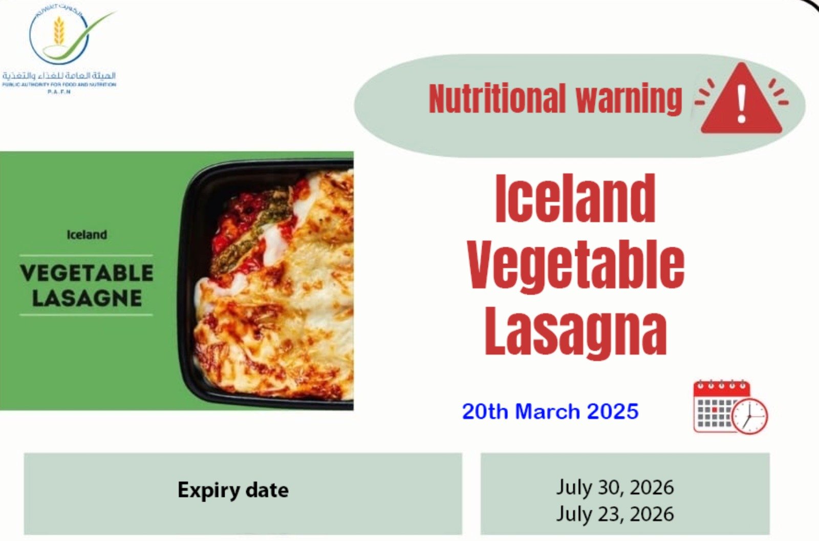 കുവൈത്ത്സി റ്റി: ഐസ്ലാൻഡ് വെജിറ്റബിൾ ലസാഗ്ന കഴിക്കരുതെന്ന് മുന്നറിയിപ്പ് നൽകി കുവൈത്തിലെ ഭക്ഷ്യ-പോഷകാഹാരത്തിനായുള്ള പൊതു അതോറിറ്റിയ. അവ കൈവശമുണ്ടെങ്കിൽ ഉൽപ്പന്നം നശിപ്പിക്കണമെന്നും അധികൃതർ ഉപഭോക്താക്കളോട് ആവശ്യപ്പെട്ടു. ഉൽപ്പന്നത്തിൽ പ്ലാസ്റ്റിക് കഷണങ്ങൾ കണ്ടെത്തിയതിനെ തുടർന്നാണ് മുന്നറിയിപ്പ് നൽകിയതെന്നും ഇത് മലിനീകരണ സാധ്യത ഉണ്ടാക്കുന്നുവെന്നും അതോറിറ്റി വ്യക്തമാക്കി. ബാധിതമായ ഉൽപ്പന്നത്തിന്റെ കാലഹരണ തീയതി 2026 ജൂലൈ 23, 2026 ജൂലൈ 30 എന്നിവയാണ്, ഭാരം 400 ഗ്രാം. മുൻകരുതൽ നടപടിയായി ഉൽപ്പന്നം വിപണിയിൽ നിന്ന് പിൻവലിക്കുകയാണ്. ഉപഭോക്താക്കൾ അവരുടെ വാങ്ങലുകൾ പരിശോധിച്ച് അവരുടെ സുരക്ഷ ഉറപ്പാക്കാൻ അതോറിറ്റിയുടെ മാർഗ്ഗനിർദ്ദേശം പാലിക്കണമെന്നും അധികൃതർ നിർദ്ദേശിച്ചു.