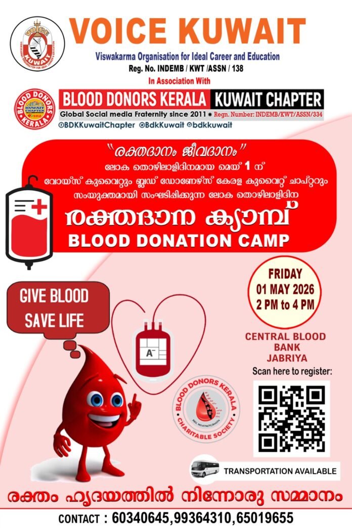 കുവൈത്ത് സിറ്റി:വിശ്വകർമ്മ ഓർഗനൈസേഷൻ ഫോർ ഐഡിയൽ കരിയർ ആൻഡ് എജ്യുക്കേഷനും ( വോയ്സ് കുവൈത്ത് ) ബ്ലഡ് ഡോണേഴ്സ് കേരള കുവൈത്ത് ചാപ്റ്ററും ( ബി.ഡി.കെ കുവൈത്ത് ) സംയുക്തമായി രക്തദാന ക്യാമ്പ് സംഘടിപ്പിക്കുന്നു.