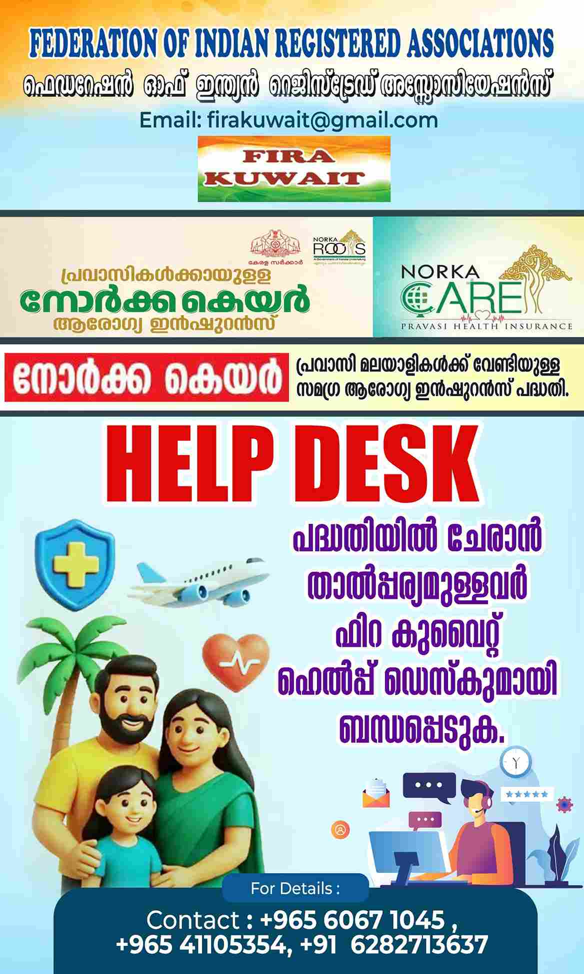 ഫിറ കുവൈറ്റ് -നോർക്ക കെയർ ഇൻഷുറൻസ് പരിരക്ഷ ഹെൽപ്പ് ഡെസ്ക്